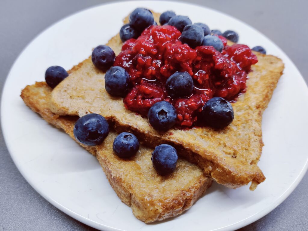 In einer flachen Schüssel oder einem tiefel Teller die Hafermilch mit der Stärke, Zimt und Zucker verrühren. Die Toastscheiben in die Flüssigkeit tauchen (ca. 3 Sekunden pro Seite, nicht zu lange sonst wird das ganze zu weich). Dann in einer mit Öl ausgepinselten Pfanne auf beiden Seiten goldgelb backen.