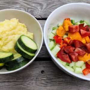 Zwiebel fein schneiden und salzen. Cocktailtomaten halbieren, Paprika klein schneiden. Alles